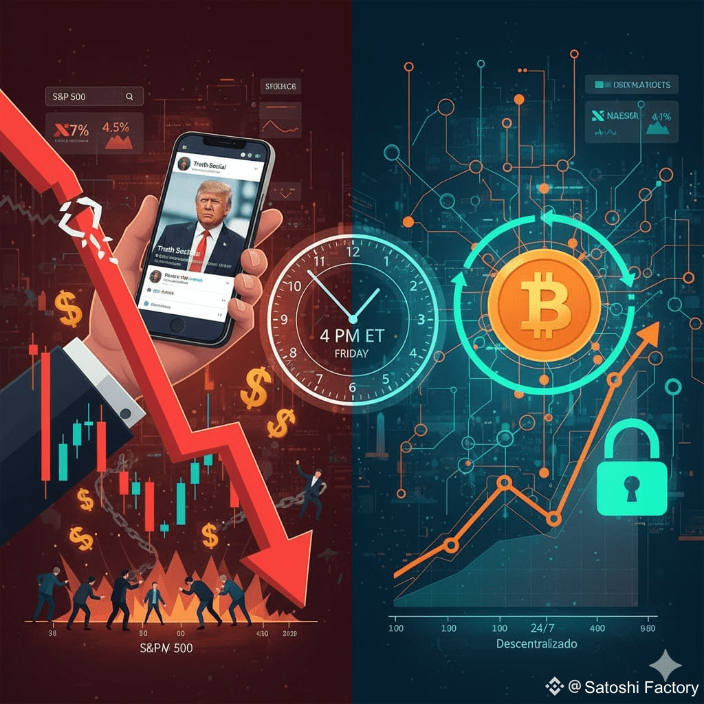 Trump sabe muy bien que los viernes, al cerrar las bolsas, es uno de los mejores momentos para lanzar este tipo de manipulaciones, ya que la mayoría de inversores ya están en fin de semana y, además, no les deja ni un segundo para reaccionar: justo después de las 4 p. m. (ET) del 10 de octubre, su post en Truth Social sobre el arancel del 100 % a China por las restricciones en tierras raras borró $2 billones del mercado bursátil en un día, dejando a los traders en calzoncillos prácticamente, con el S&P 500 cayendo 2.7 % y el Nasdaq 3.6 %. Algo que no ocurre con Bitcoin, ya que, además de ser descentralizado y no depender de ningún gobierno, puedes operar con él los 365 días del año, las 24 horas del día.