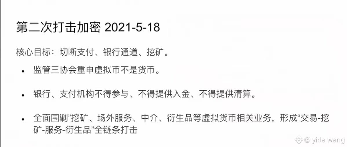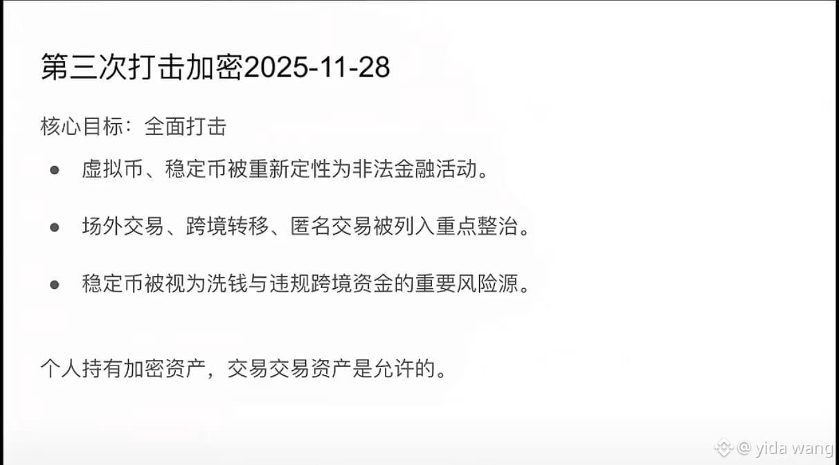 历史上三次打击加密对市场产生了怎样的影响?分别是2017年9月4号,2021年5月18号,2025年11月28号,2017年九四发文以后,大饼从5000跌到三千,下跌了30%后面的影响就是很多交易所都关门了,法币直接购买比特币的通道没了。2021年5月18日,大饼从6万直接跌到3万,下跌50%,这次对市场影响比较大,从历史上来看,下跌幅度也比较大,前段时间发文大饼从91000暴跌至90800,下跌0.2%左右,这几个部门对加密市场已经没什么影响了,所以大家以后不需要再关注他是不是发文了,更应该关注美国的政策和资金对市场的影响。因为中国对这个市场已经没有任何影响力了,因为市场已经完全不关注他在说什么了,再详细看一下,第一次打击是2017年94核心目标是切断融资,还有交易,因为ICO太猖狂了,随便来一个白皮书上了交易所都是几十倍几百倍的涨。那时候赚钱太容易了,炒作太容易了。然后禁止任何机构给代币融资,交易所关停,法币不能直接兑换加密货币,第二次打击是2021年5月18日,主要切断支付通道,银行通道,不能为加密市场提供资金,重申虚拟币不是货币,另一点重要的是对挖矿行业全面打击。比如说那时矿主刚投资在四川那边搞个小电厂,刚投资上亿几千万搞的比特币挖矿矿场,没过几天就被清退了,损失非常大,二一年以后,国内挖矿全部被清退出去了,基本上都跑到第三世界或俄罗斯,美国加拿大那边去了。现在美国是算力最大的市场,但据说中国的算力又回到第三了,这是什么原因,我估计大家也能懂。这是第三次打击,前段时间也就是2025年11月28号,现在的目标还是全面打击,但是他对这个市场基本上没有一点影响力了,盘面没什么波动,但我觉得大家在币圈需要注意的是,把稳定币,虚拟币重新定义为非法金融活动,强调了跨境转移、场外交易和稳定币洗钱这一块,我觉得比较重要的是你持有加密资产或交易资产,都没有问题,对你个人没什么影响。但是,如果你去出入金,再加上现在反诈的权利非常大,动不动就把你名下所有卡封了。现在上面又有了批文,所以我觉得对于交易没什么影响,但对于你出入金的话,可能会比较影响,所以后面出入金尽量找熟人,比如说,你经常交易的币商或朋友之间,哪怕多付几个点的手续费都没关系。尽量找熟人,因为熟人就算出了问题,也比较好解决,非常有必要去香港办几张香港卡,然后走港币的出金通道,这块自己可以去研究研究。$BTC