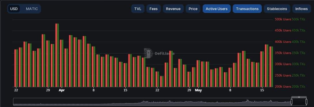 After a long period of tranquility, network activity on Polygon [MATIC] is beginning to gain strong momentum. According to DeFiLlama, the number of active users on the Ethereum [ETH] sidechain soared to 389,000 on May 16th, hitting a five-week high.