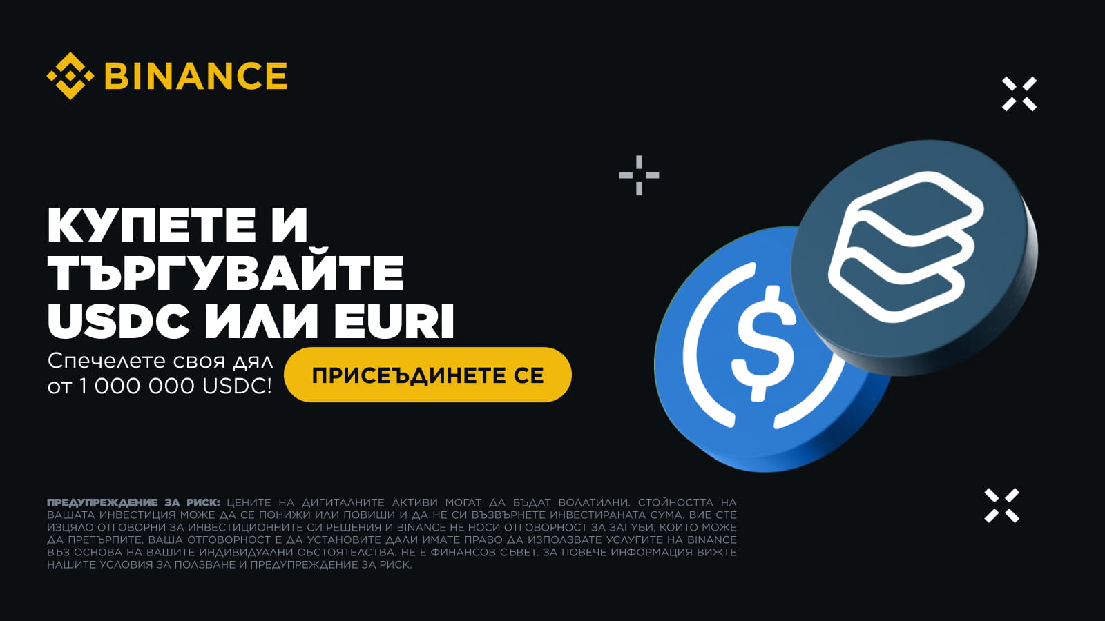 *Новите потребители в Промоция А се отнася за потребители, които не са купували USDC или EURI преди 27.02.2025 г. в 16:00 ч. (UTC).