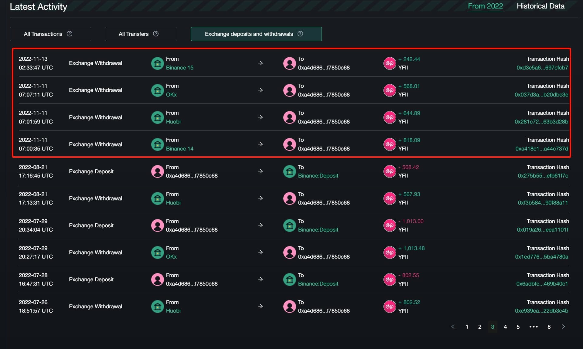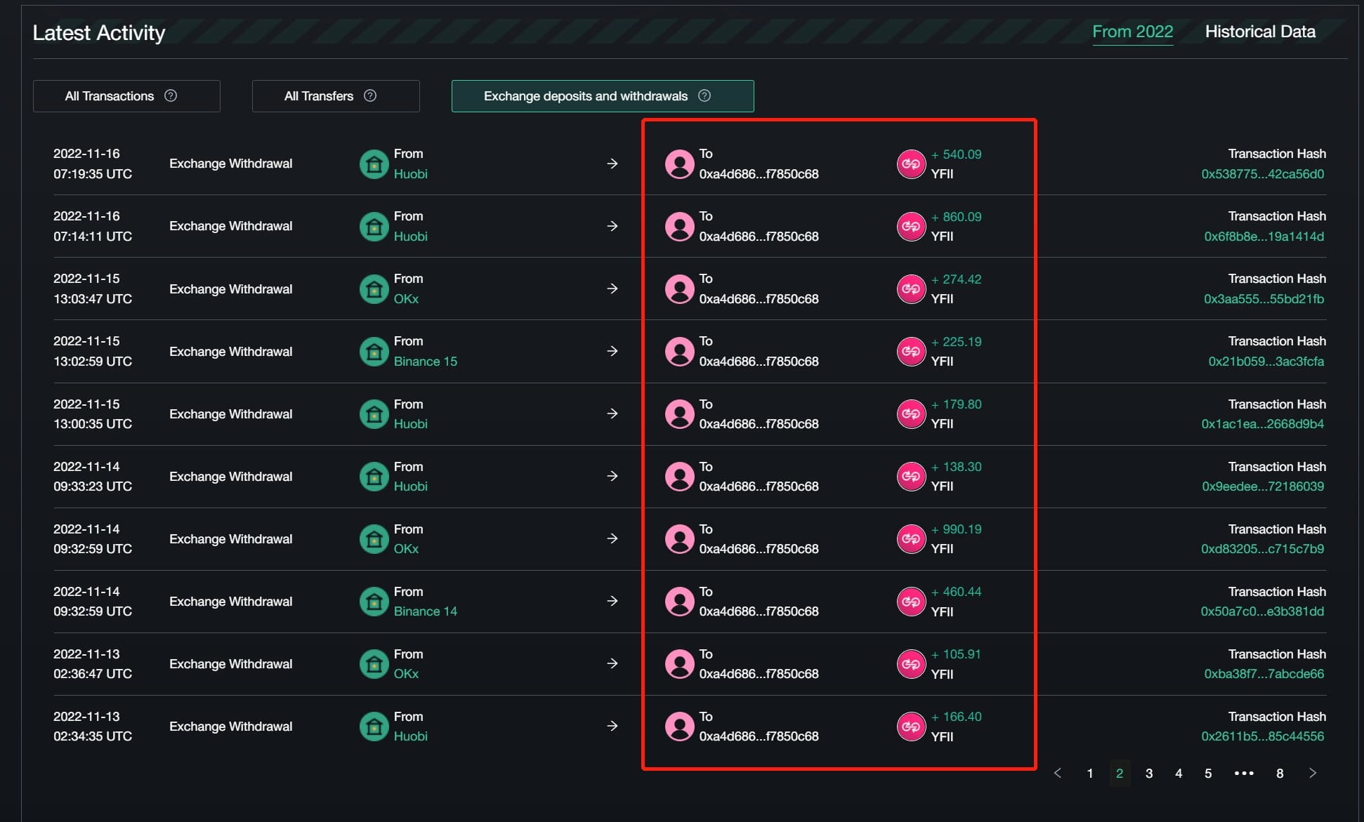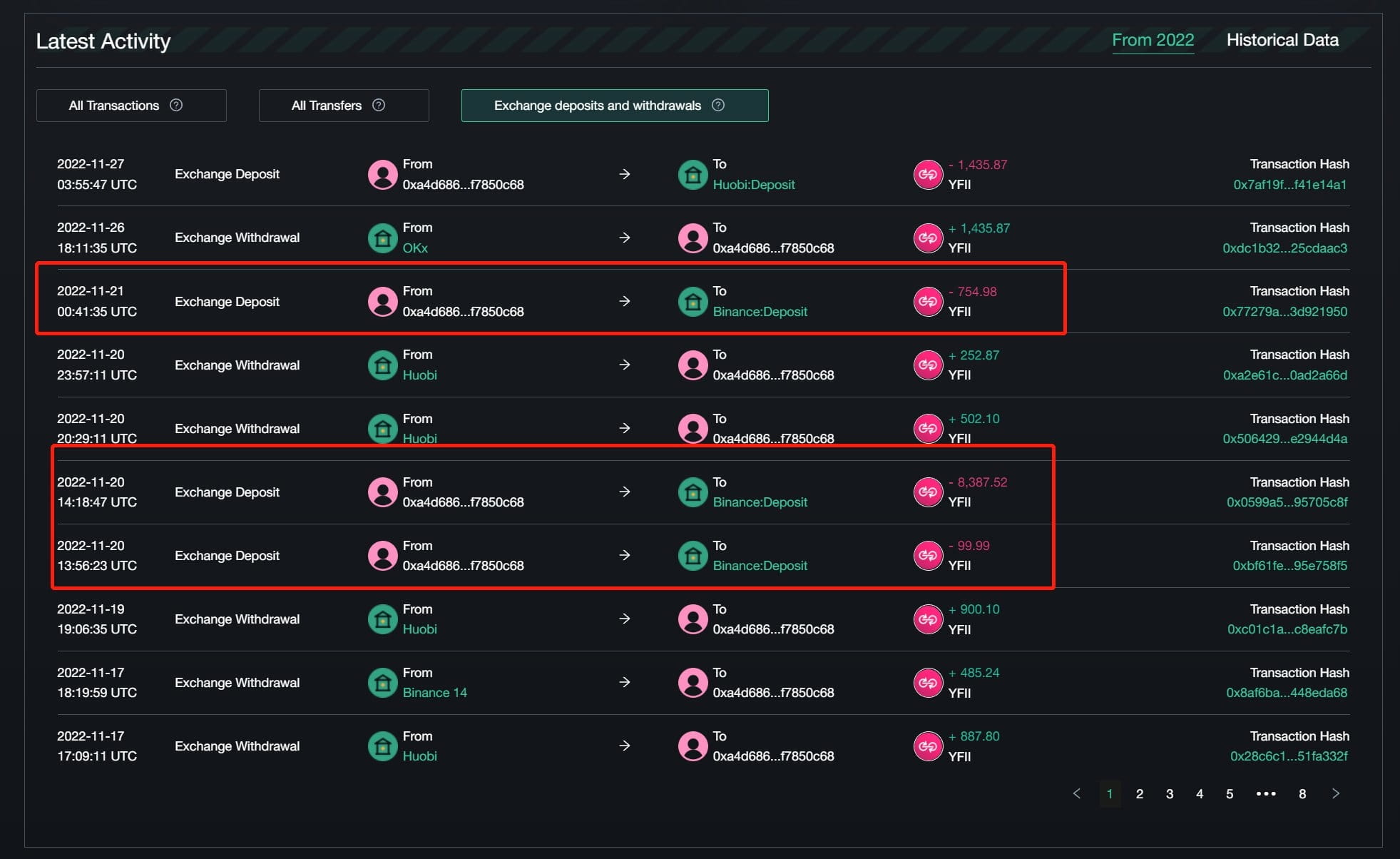 A zde nastává bod změny. 20. listopadu a 21. listopadu velryba převedla všech 9241 $ YFII (23 % z celkové zásoby) na #binance
