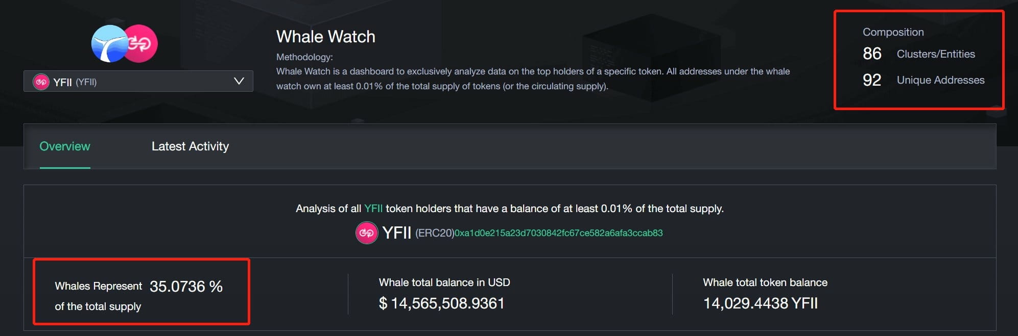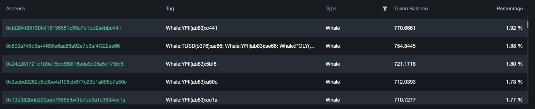 Když už jsme u velryb, podívejme se na velrybí hodinky $YFII od @0xWatchers . Ukazuje, že 86 velryb ovládá 35 % celkové nabídky!