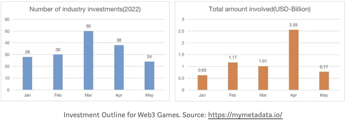 Ve druhé polovině roku 2021 se začal objevovat koncept her Web3/metaverse a jeho vynikající krátkodobá ziskovost si podmanila kapitál i tradiční vývojáře her. Stále více společností rizikového kapitálu hledá na trhu projekty vysoké kvality v rané fázi. Za posledních 5 měsíců tohoto roku investovaly přední VC instituce do 170 Web3 her a projektů metaverse v celkové výši 6,13 miliardy USD