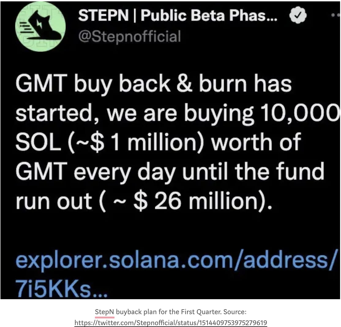 Tuto část příjmů si odnese samotný projektant. LooksRare to dělá, zatímco Stepn je o něco lepší, protože v prvním čtvrtletí oznámil plán zpětného odkupu, bohužel, žádná následná opatření. Buyback je nejběžnějším typem návratnosti hodnoty pro držitele tokenů (včetně prvních investorů).