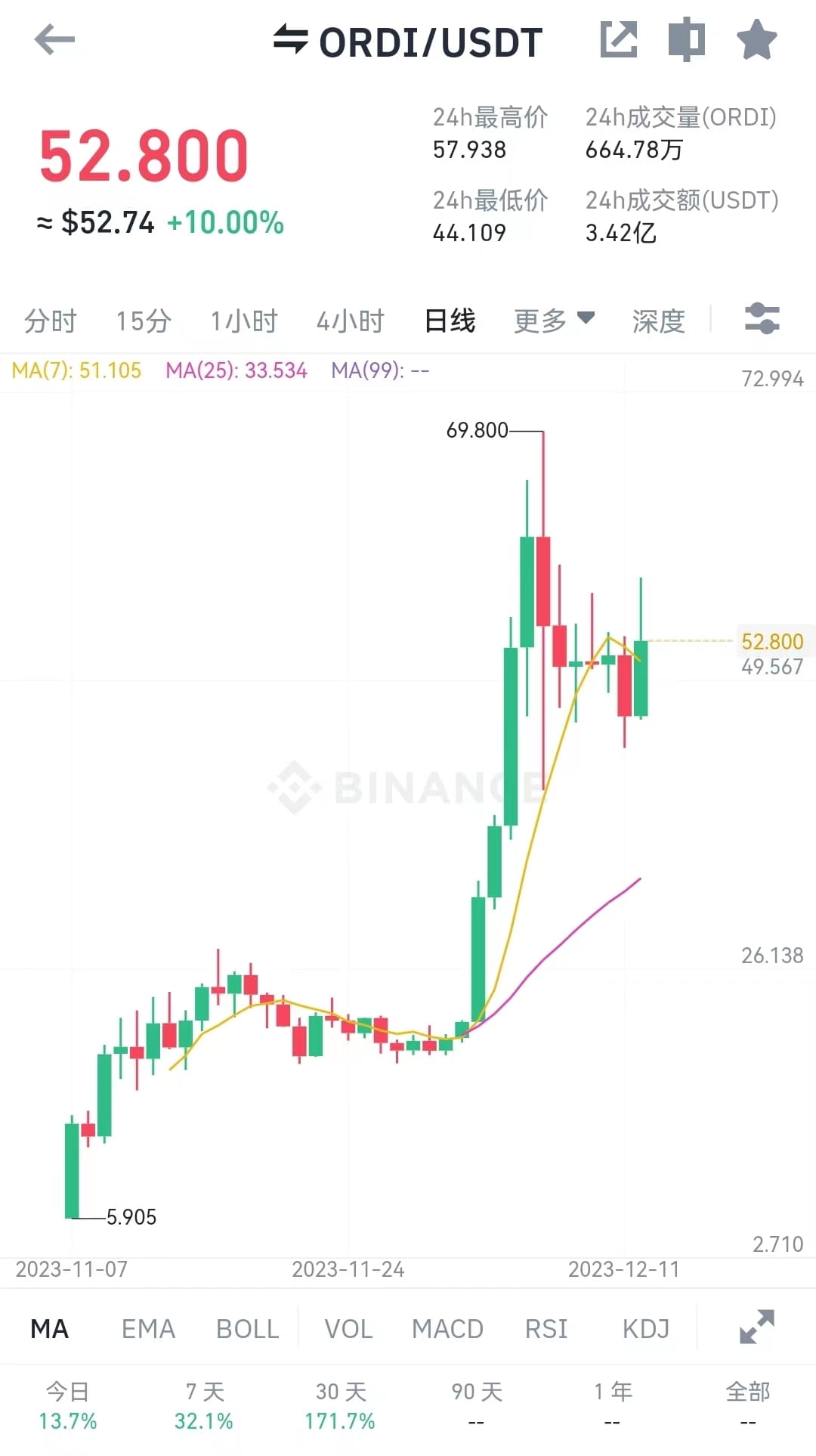ORDI od svého spuštění roste a dosáhlo maxima 69,8 USD. Následně se začalo diskutovat o tom, zda je Bitcoin Inscription chyba a zda by měl být opraven nebo zakázán, ORDI v posledních dvou dnech kolísalo na 47 USD.
