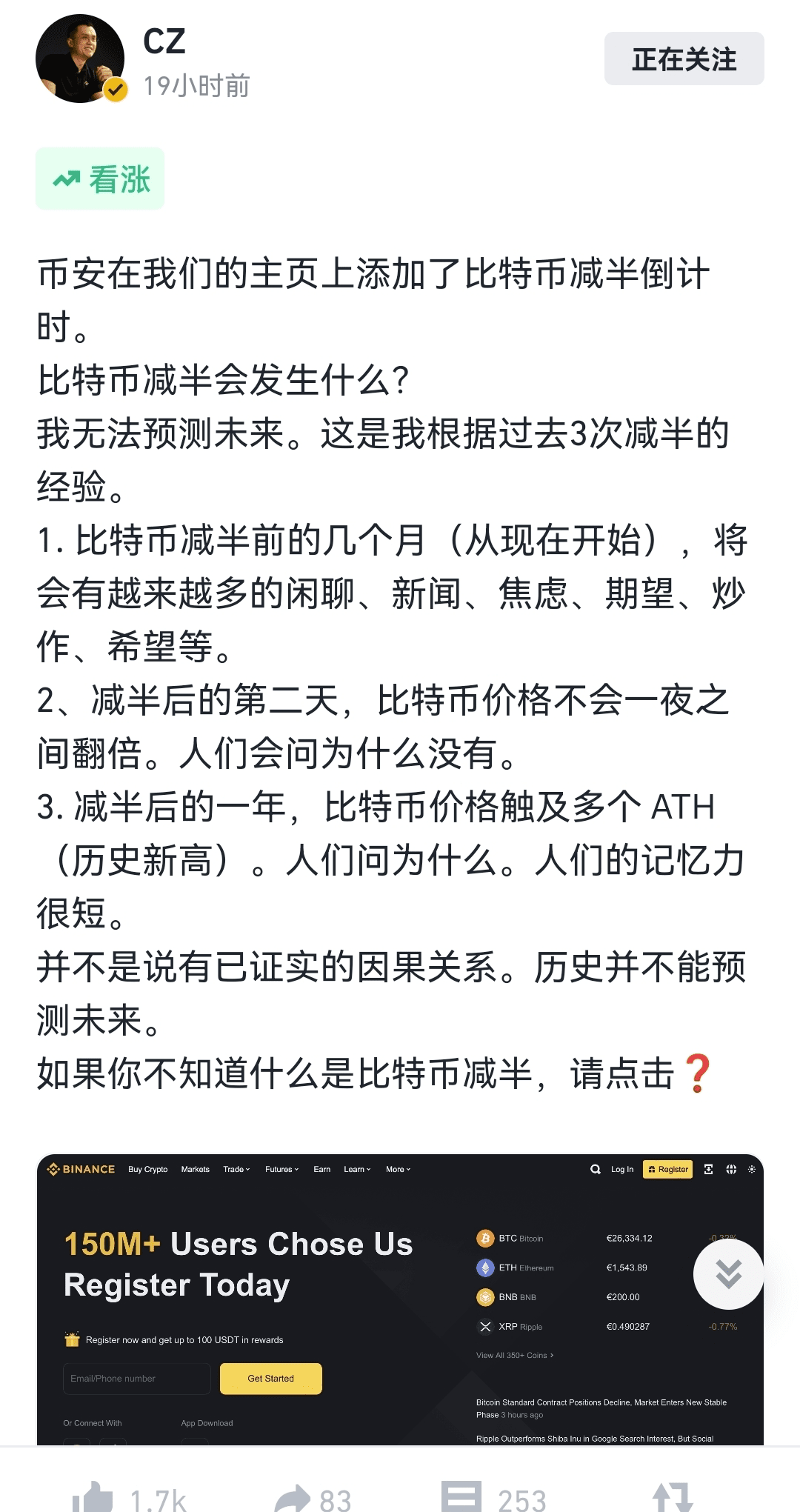 #cz Zveřejnil jsem své názory na cyklus půlení na Binance Square a věřil jsem, že trh bude v posledních měsících relativně medvědí Po půlení nemusí trh nutně přijít okamžitě, ale nebude to zpochybňovat nejvyšší bod mnohokrát za rok.