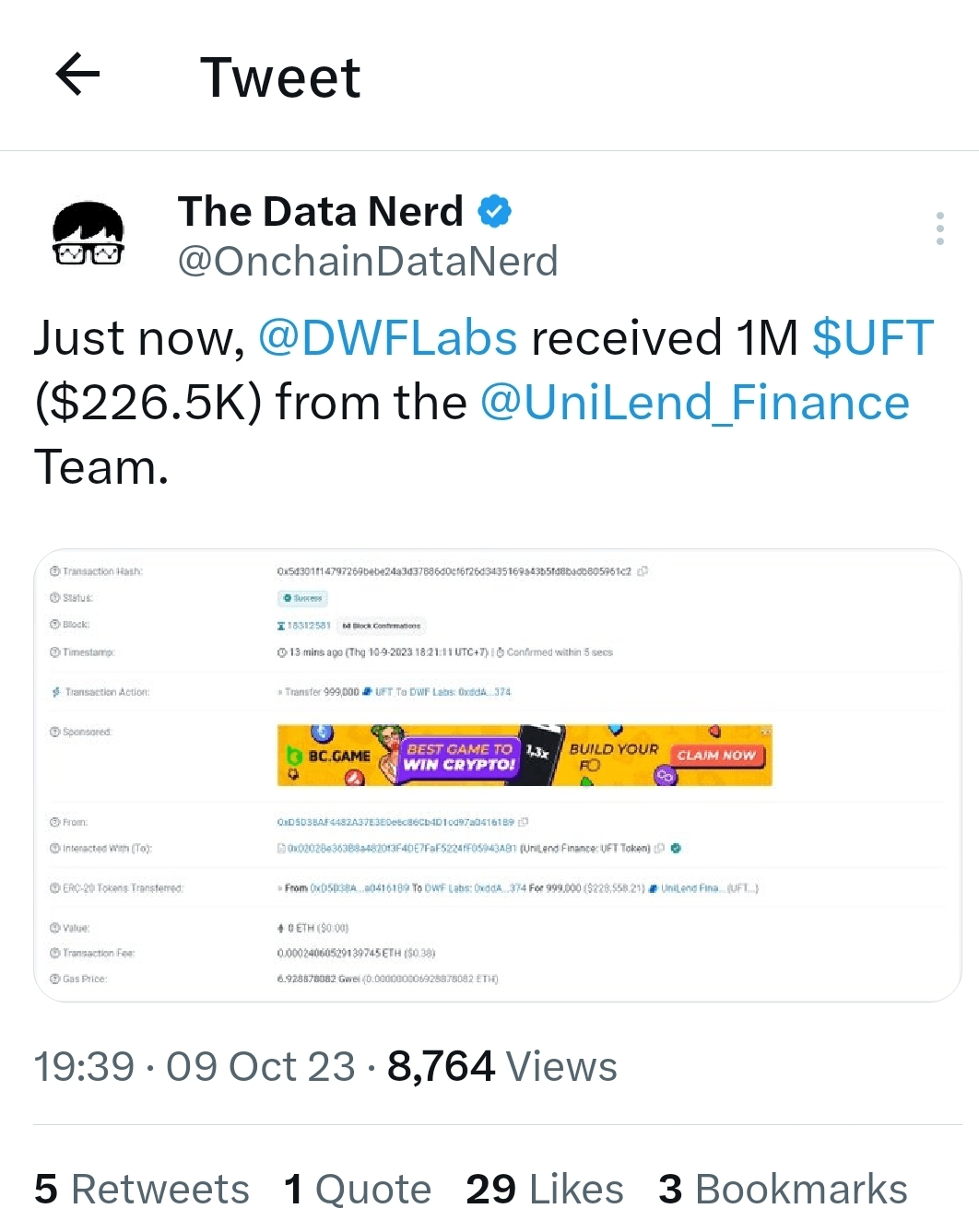 #DWFLab Dnes přijato 1M$UFT , v hodnotě asi 226 000 $, můžete tomu věnovat pozornost.