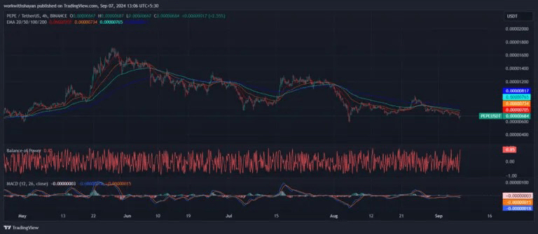 4hodinový cenový graf Pepe naznačuje, že medvědi zvyšují svou dominanci poblíž linie okamžité podpory, protože cena PEPE směřuje k dalšímu poklesu. Býci v současnosti usilují o udržení nad trendovou linií EMA20.