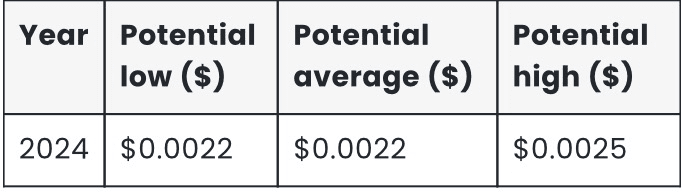 V roce 2024 se očekává minimální očekávaná cena akcií Pepe na úrovni 0,0022 USD. Vrchol může dosáhnout na maximální hodnotě 0,0025 USD s průměrnou obchodní cenou 0,0022 USD po celý rok.