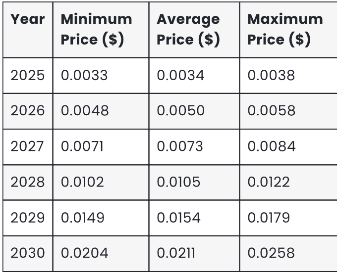 Na základě hloubkové technické analýzy minulých dat PEPE se předpokládá, že cena v roce 2030 dosáhne minimální hodnoty 0,0204 USD. Maximální cena by mohla dosáhnout až 0,0258 USD s průměrnou hodnotou 0,0211 USD v průběhu celého roku.