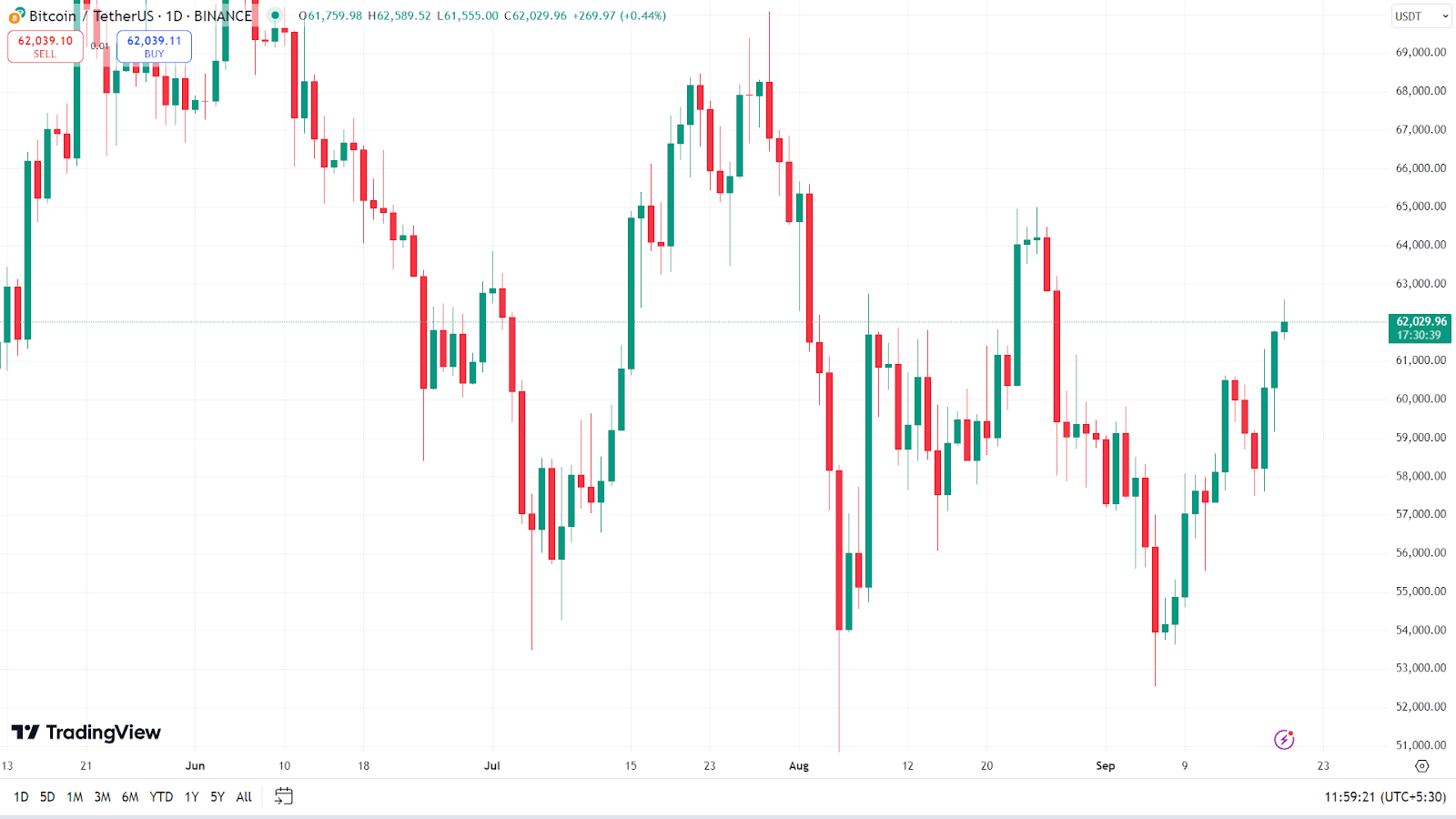 Bezprostředně poté, co americká centrální banka oznámila své rozhodnutí snížit svou klíčovou zápůjční sazbu o půl procentního bodu, se bitcoinový trh dotkl měsíčního maxima. Včera BTC uzavřel na přibližně 61 783 $. Při pohledu na denní graf bitcoinu je jasné, že bitcoin se pohybuje silně nahoru. Je bitcoin na začátku nového býčího trendu?