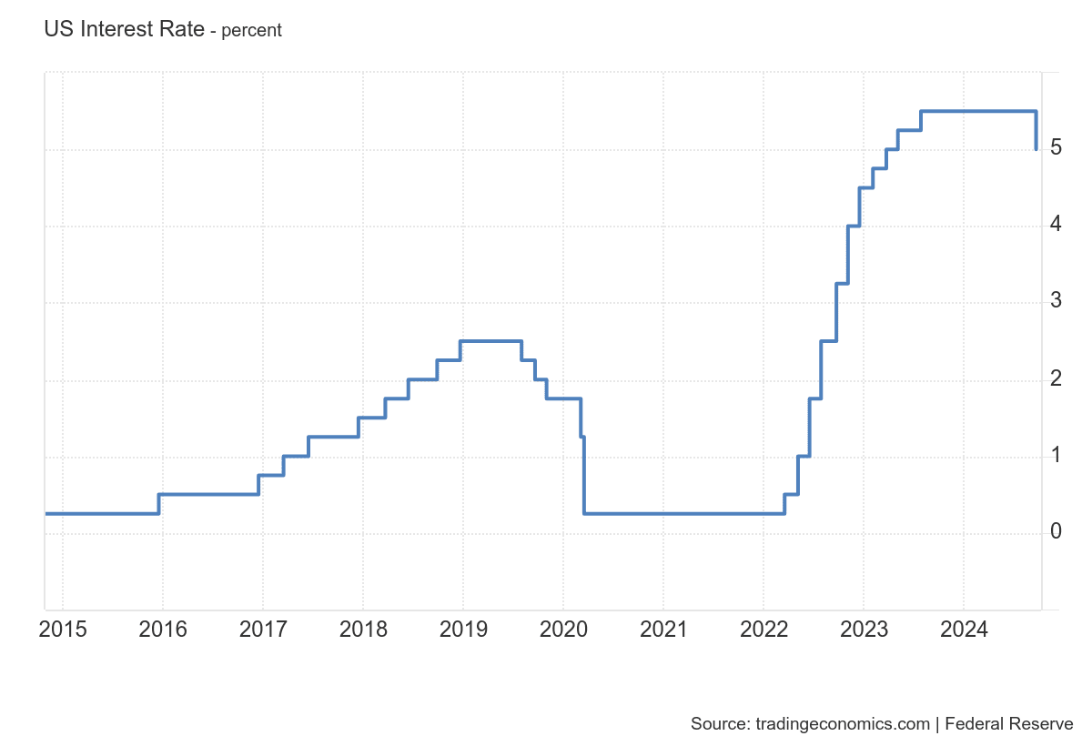 Úroková sazba amerického Fedu se letos v srpnu pohybovala kolem 5,5 %. Mezi 28. únorem 2022 a 26. červencem 2023 zaznamenala rychlý růst. Na začátku této dynamiky byla sazba pouze 0,25 %. Když se tempo ustálilo, vynesla sazba na vrchol 5,5 %. Sazba zůstala nezměněna, dokud se Federální rezervní systém včera nerozhodl snížit sazbu o půl procenta. Nyní je sazba na úrovni 5 %. Zajímavé je, že je to poprvé od března 2020, kdy Federální rezervní systém zavedl snížení sazeb. Dne 19. června 2019 byla sazba na 2,5 %. Dne 29. ledna 2020 byla snížena na 1,75 % a později byla prudce snížena na pouhých 0,25 % 15. března 2020 – pravděpodobně jako součást úsilí v boji proti pandemii.