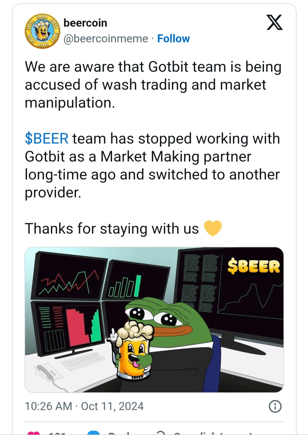 Dokonce i meme coiny, které tvrdí, že přestaly obchodovat s Gotbit před tímto týdnem, zdůraznily své odsouzení údajného chování společnosti.
