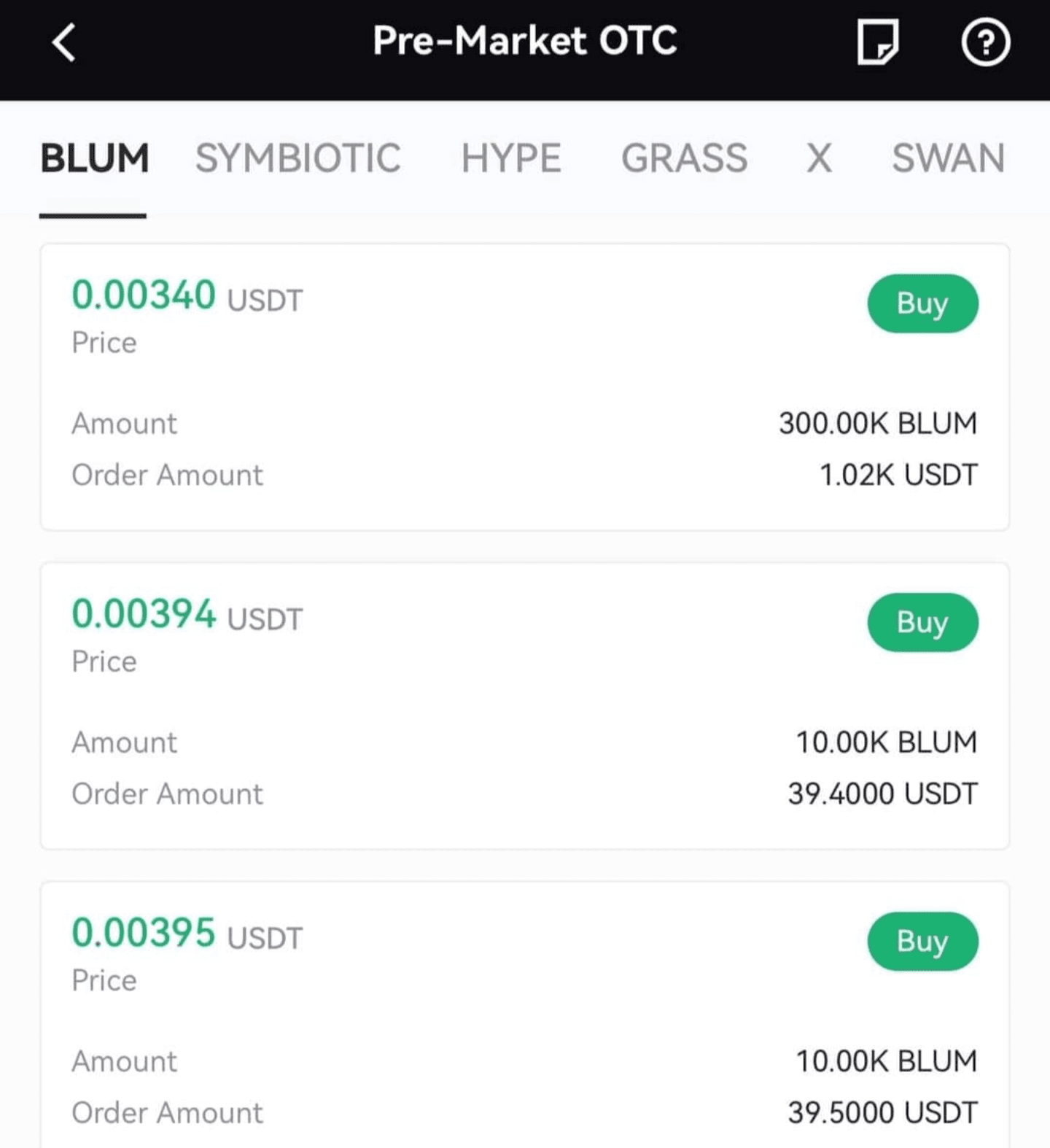 Z poskytnutého snímku obrazovky se Blum Coin aktuálně obchoduje v rozmezí 0,00340 až 0,00395 USDT, se značnými částkami objednávek. Jednou z výhod je nákup v hodnotě 300 000 BLUM za 1,02 tis. USDT, což naznačuje značný raný zájem ze strany obchodníků s velkým objemem.