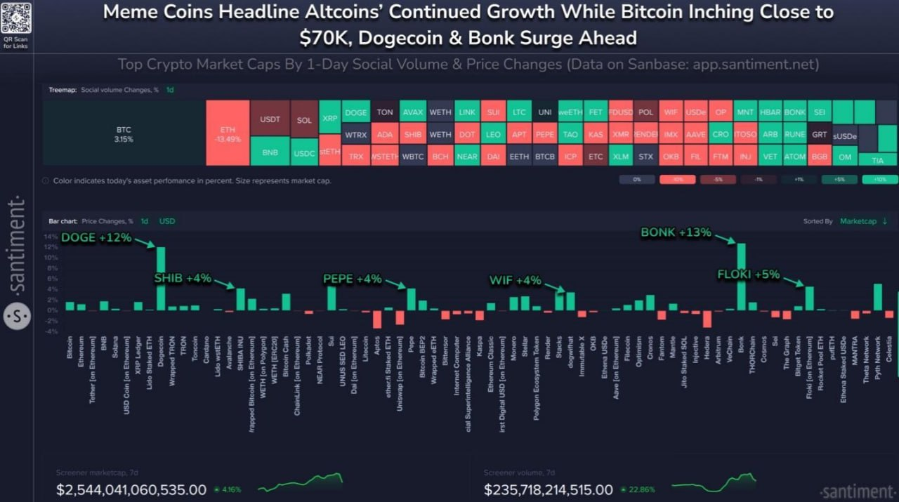 Pozoruhodně, i přes náročný čtvrtek, kdy SHIB klesl o 5 %, obchoduje se kolem 0,0000182 USD, token se za poslední měsíc vyznačuje pozoruhodným výkonem s 33% nárůstem podle #CoinMarketCap dat. Výkon tokenu se shoduje s širšími tržními pohyby, jak potvrzuje analýza trhu od Santiment, která ukazuje významné vrcholy sociálního objemu napříč meme coinami, včetně Dogecoinu $BONK