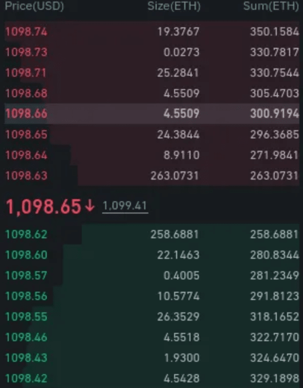 Příklad: V systému knihy objednávek, jako je výměna trvalých kontraktů na Binance, je střední cena nejlepší nabídka (cena, kterou získáte, když prodáváte na trhu) a nejlepší poptávka (cena, kterou získáte při nákupu na trhu ). průměrná hodnota. Obrázek 1 ukazuje screenshot knihy objednávek pro trvalou smlouvu ETH na Binance. Můžeme vidět, že nejlepší prodejní cena je 1 098,63 $ a nejlepší nákupní cena je 1 098,62 $. Pokud nekoupíme více než 263,0731 ETH, budeme obchodovat za nejlepší prodejní cenu, pokud před námi neprovede jiný obchodník nebo pokud nebude limitní příkaz za tuto cenu zrušen. Pokud budeme obchodovat nad tuto částku, cena mírně klesne. Pokles ceny ve srovnání se střední cenou se nazývá skluz.