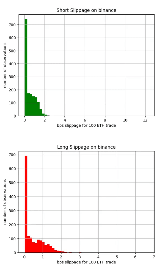 Pro dvě burzy založené na objednávkách v našem vzorku, dYdX a Binance, shromažďujeme data o objednávkách prostřednictvím jejich REST API. Náš kód Python stahuje data knihy objednávek každou minutu a shromažďuje data v databázi PostgreSQL. Poté vypočítáme průměrnou cenu dlouhých a krátkých 100 ETH obchodů pro každé pozorování knihy objednávek. Všechny výsledky jsou zprůměrovány, aby se získal konečný údaj o skluzu.