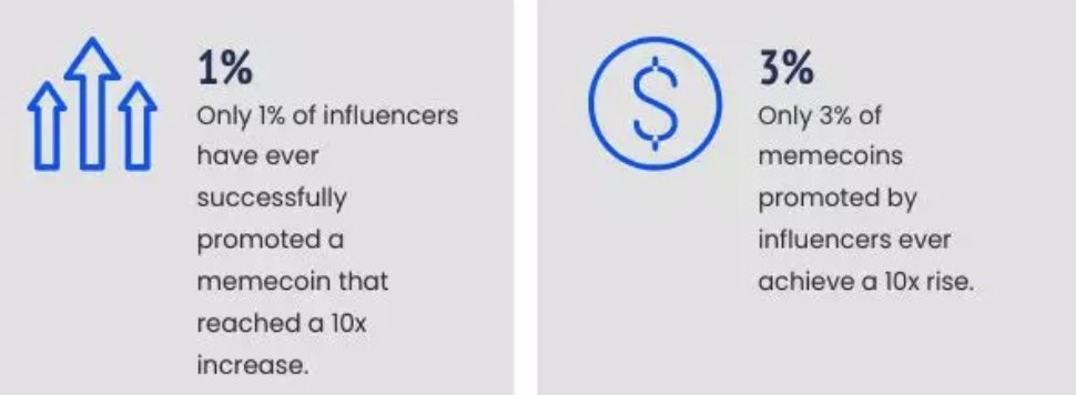 Dosáhnout značných zisků (např. 10x návratnosti) s meme coiny propagovanými influencery je téměř nemožné. Pouze 1 % influencerů propaguje coiny, které dosahují těchto výšin, a pouze 3 % jejich propagovaných tokenů někdy dosáhne této úrovně úspěchu.