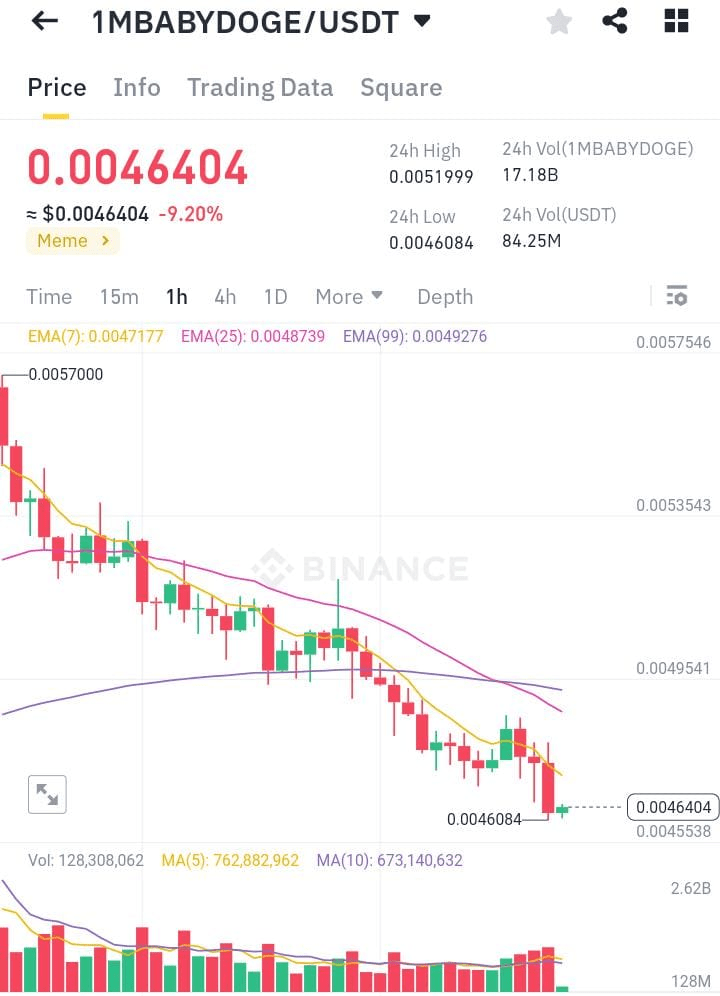 Pár 1MBABYDOGE/USDT zažívá významný pokles, s poklesem o 9,20% za posledních 24 hodin. Aktuální cena $0.0046404 se blíží 24-hodinovému minimu $0.0046084.