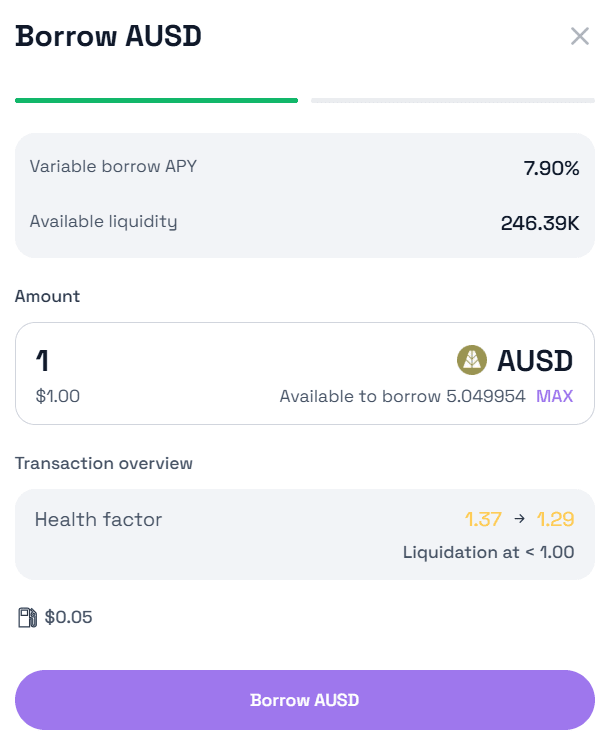 Úroková sazba AUSD je vyšší (-6.83%), doporučujeme, pokud nemáte potřebu používat AUSD, půjčit si 1 AUSD a ihned po dokončení úkolu L3 splatit 1 AUSD.