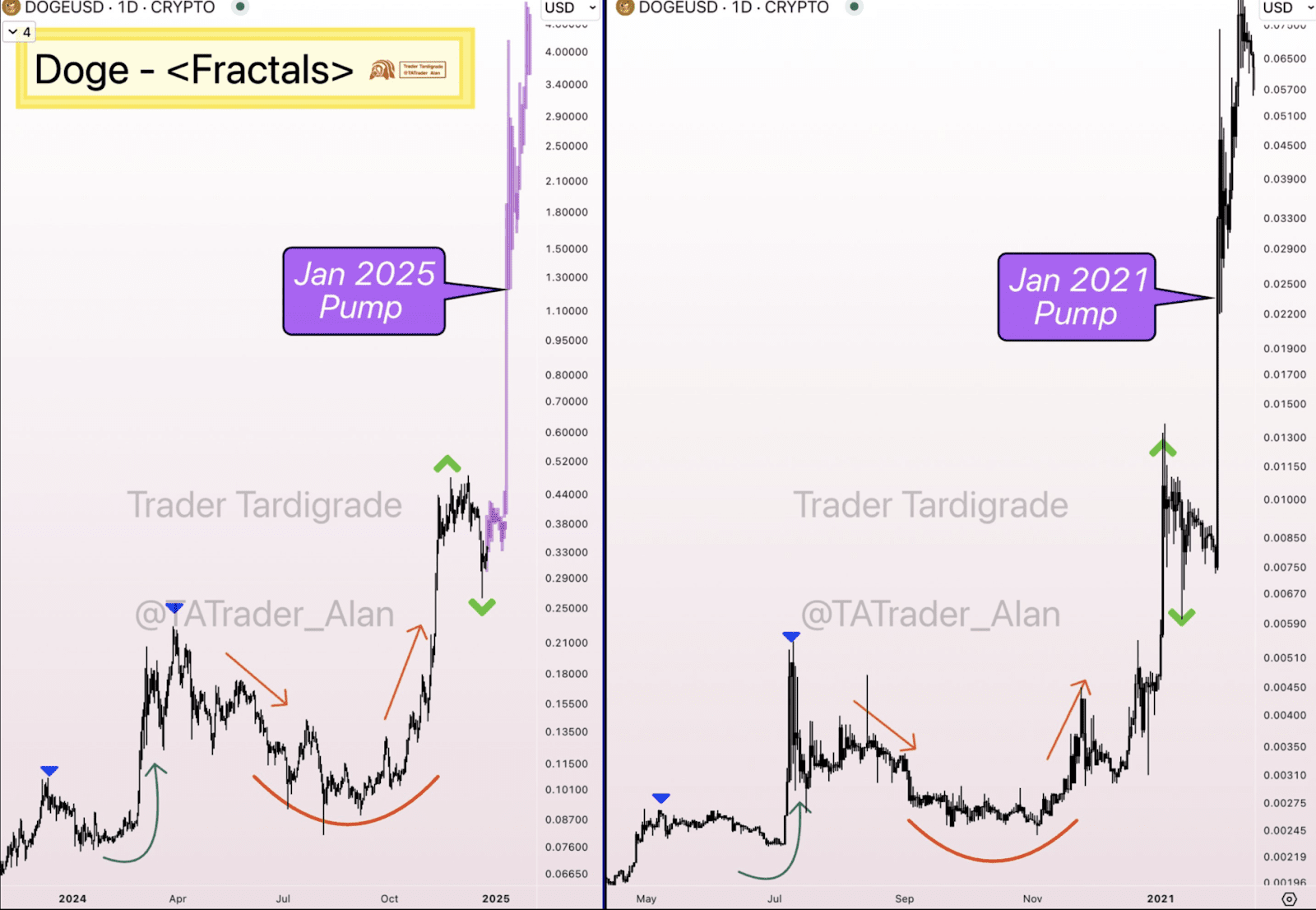 Známý analytik, Trader Tardigrade, objevil podobnosti mezi býčím trhem v roce 2021 a současným vývojem ceny. Tento analytik zdůrazňuje, že kryptoměna opakuje stejnou fázi konsolidace, kterou zažila v roce 2021. Cena DOGE vzrostla v lednu 2021, po čemž následovala malá konsolidace, která vedla k velkému průlomu na ATH. V současnosti cena vykazuje stejný vzor konsolidace, což naznačuje, že další vývoj ceny v lednu by mohl být měsícem Velkého třesku.