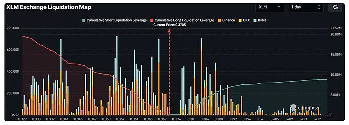 K dnešnímu dni jsou hlavní likvidační zóny $0.35 na spodní straně a $0.38 na vrchní, přičemž obchodníci používají nadměrnou páku na těchto úrovních, podle likvidační mapy burzy XLM.