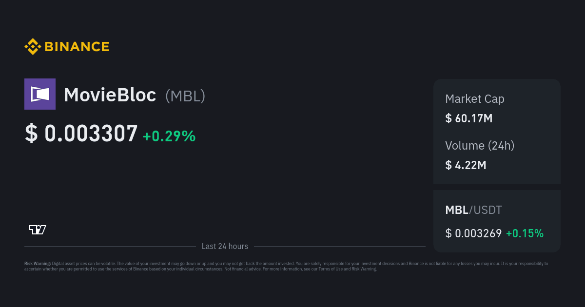 K 31. lednu 2025 se MovieBloc (MBL) obchoduje přibližně za 0,00327 USD, což odráží mírný nárůst o 0,00184 % od předchozího uzavření.