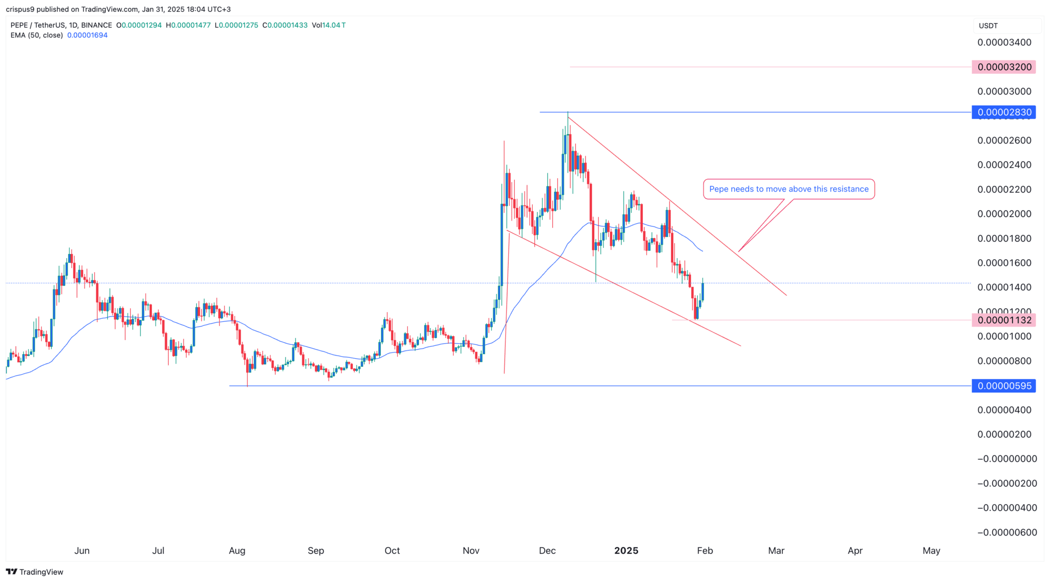 🔹 Průlom nad 50denní MA by naopak mohl posunout Pepe směrem k jeho historickému maximu $0.00002830 (+100 % z aktuálních úrovní).