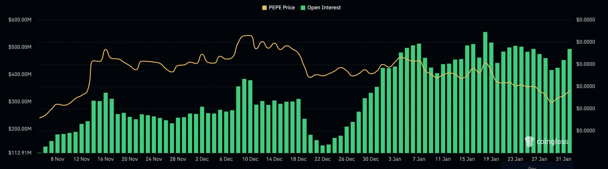 Pepe, třetí největší meme coin, se vzpamatoval ze svého ročního minima $0.00001132. Přesto zůstává 50 % pod svým vrcholem z počátku tohoto roku.