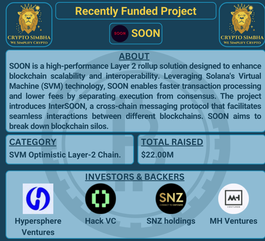 🔹 O projektu: SOON je vysoce výkonné řešení Layer 2 rollup navržené pro zlepšení škálovatelnosti a interoperability blockchainu. Využitím technologie Virtuálního stroje Solana (SVM) umožňuje SOON rychlejší zpracování transakcí a nižší poplatky oddělením vykonávání od konsensu. Projekt zavádí InterSOON, protokol pro zprávy napříč řetězci, který usnadňuje bezproblémové interakce mezi různými blockchainy. SOON usiluje o odstranění blokových sil, což činí víceřetězcové aplikace přístupnější pro vývojáře a uživatele. Díky své oddělené architektuře podporuje SOON aplikace s vysokým výkonem, včetně her a DeFi, aniž by byl vázán na omezení Etherea. Token $SOON zajišťuje správu, staking a poplatky za transakce v rámci ekosystému, čímž podporuje decentralizaci a zapojení komunity. Řešením klíčových výzev v technologii blockchain si SOON klade za cíl dosáhnout masové adopce a vytvořit efektivnější a propojenější prostředí blockchainu.🚀🌐
