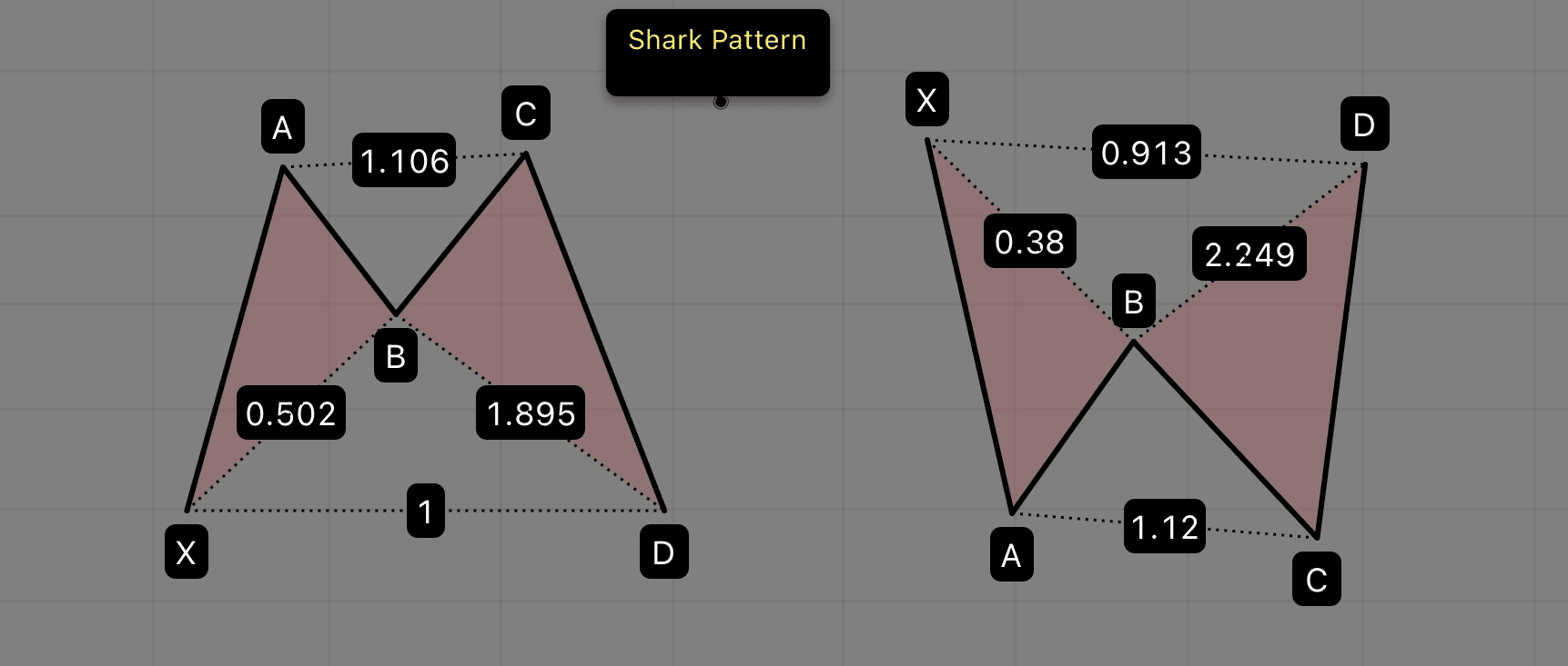 - B Bod: 0.382–0.618 retracement XA.