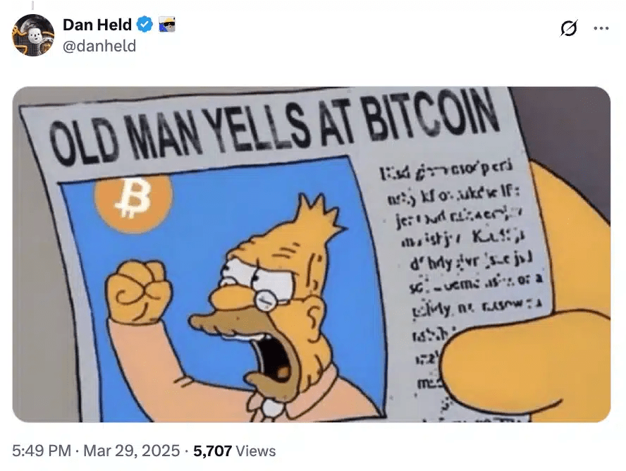 Významný obhájce Bitcoinu Dan Held se také zapojil do konverzace, posmíval se Schiffovi pomocí meme a naznačil, že Schiffovy neustálé kritiky ztrácí svůj dopad.