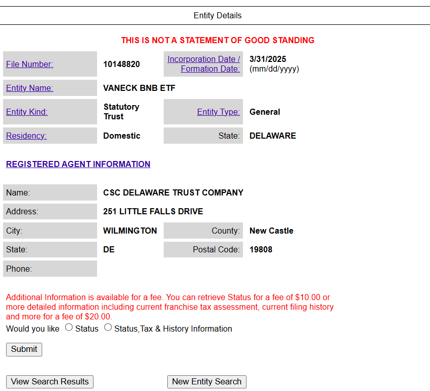 Krajina crypto ETF v USA se právě stala mnohem zajímavější! VanEck, těžká váha v oblasti správy investic, oficiálně registroval fond obchodovaný na burze (ETF) pro Binance Coin (BNB) ve státě Delaware.