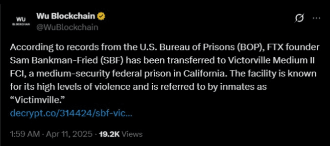 Ve 32 letech byl Sam Bankman-Fried převezen do Victorville po více než roce stráveném v brooklynském metropolitním detenčním centru a krátkém zastavení v federálním transferovém centru v Oklahomě. Jeho přesun přišel krátce poté, co poskytl neautorizovaný rozhovor novináři Tuckeru Carlsonovi, kde popsal každodenní život v brooklynském zařízení. Po rozhovoru byl údajně umístěn do samotky.