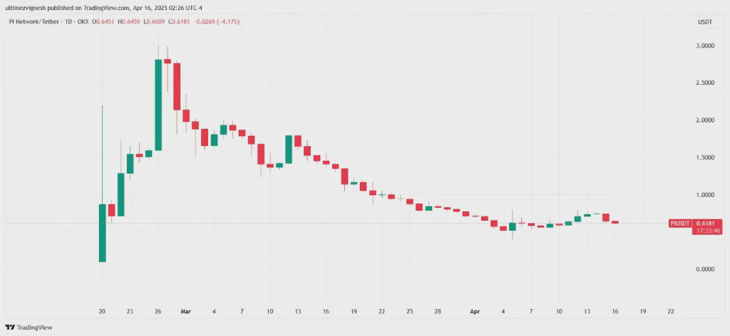 Od 5. dubna se trh pohybuje mezi 0,4040 USD a 0,7894 USD. V současnosti se PI obchoduje za 0,6174 USD.