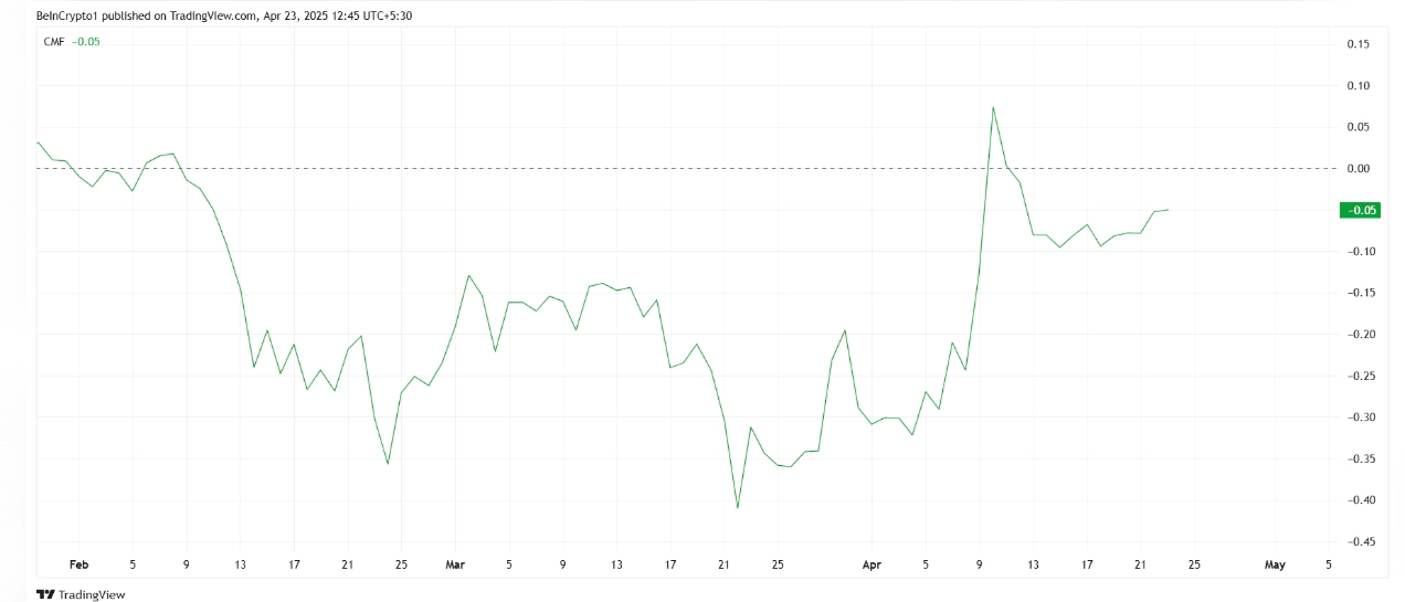 Makro moment Onyxcoinu také představuje výzvy pro investory. Indikátor Chaikin Money Flow (CMF), který měří objemově vážený průměr akumulace a distribuce, se aktuálně nachází v negativním teritoriu, což naznačuje, že odlivy stále dominují trhu. Ačkoliv CMF mírně roste, nedokázal udržet žádný významný vzestup. Tato pokračující dominance odlivů naznačuje, že XCN se stále snaží udržet býčí moment.