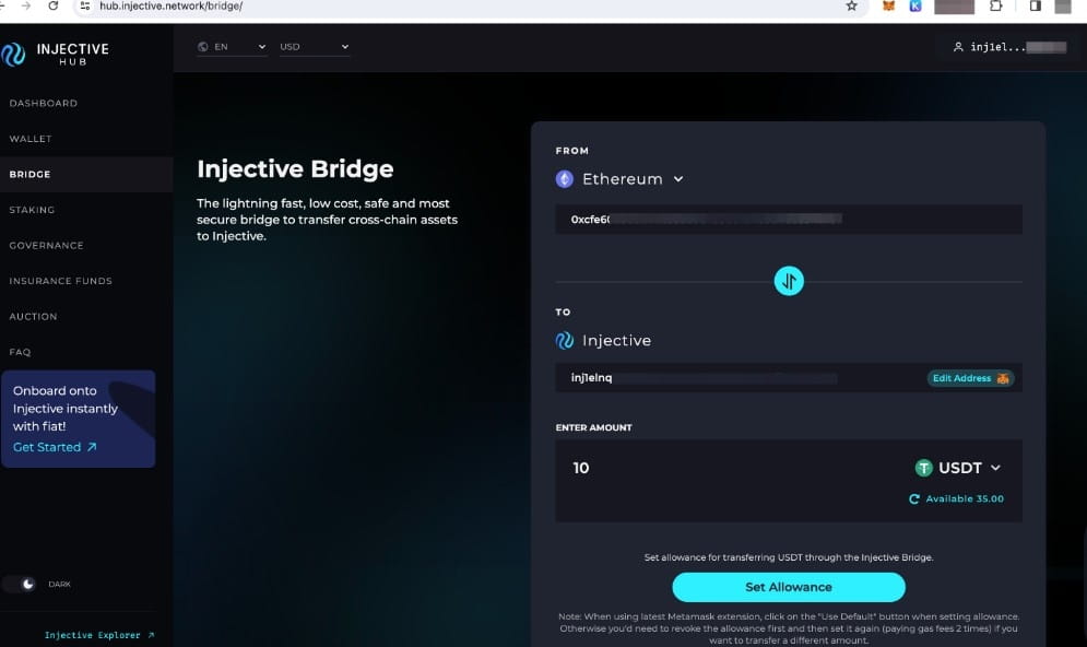 Cílem tohoto článku je poučit vás o přechodu z Etherea na Injective prostřednictvím vaší peněženky Metamask. Výukový program bude ilustrovat proces s použitím USDT jako příkladu, i když máte možnost přemostit jakékoli aktivum ERC20 podle vašich preferencí!