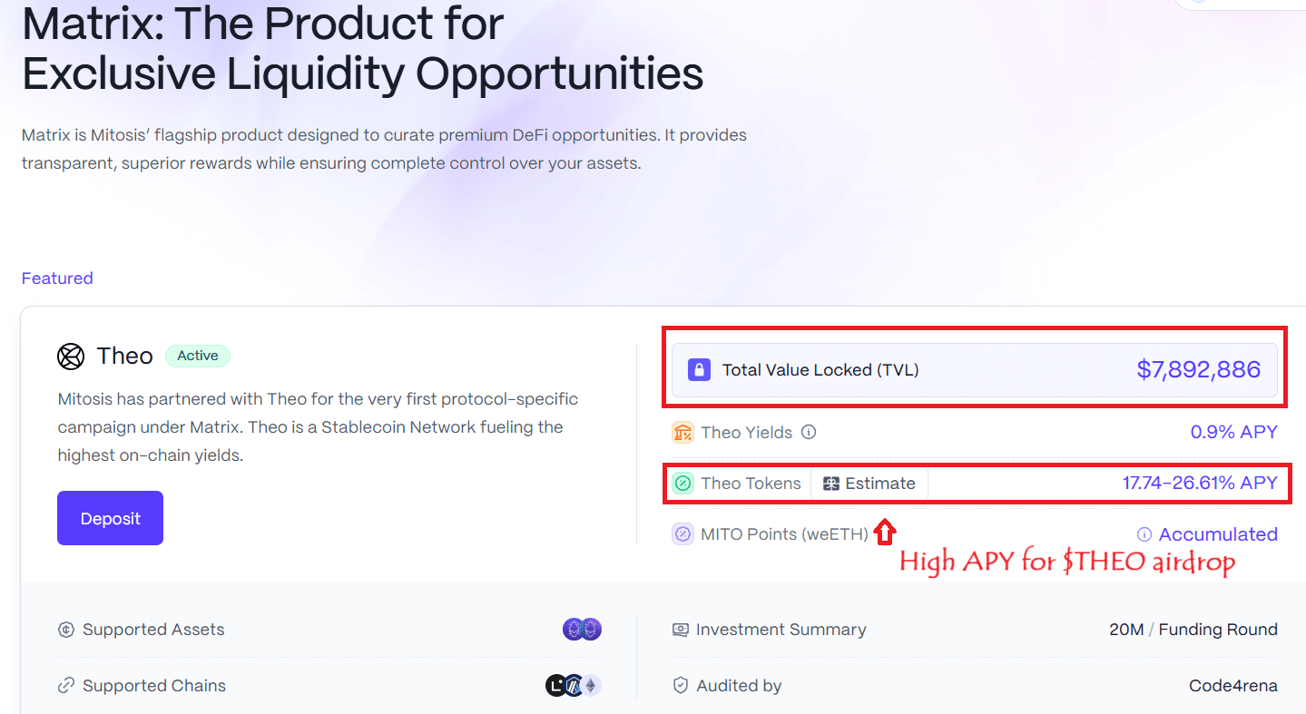 Zajímavé je, že panel Matrix Vaults poskytuje odhadované výnosy z airdropu Theo, APY dosahuje 17.75-26.62%, APY je odhadováno pomocí FDV.