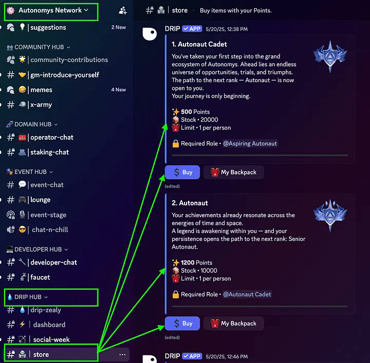 #Autonomys vytvořil propojenou strukturu pobídek, která spojuje platformy jako Zealy, Discord, Drip a exkluzivní obchod, čímž vytváří plynulý zážitek, kde každá akce skutečně má význam. Členové komunity získávají body plněním úkolů na Zealy a účastí na živých akcích, losováních a dalších aktivitách prostřednictvím Drip na Discordu. Na konci každého měsíce jsou body Zealy převedeny na Drip, což zajišťuje, že pokrok je zachován a zesílen.
