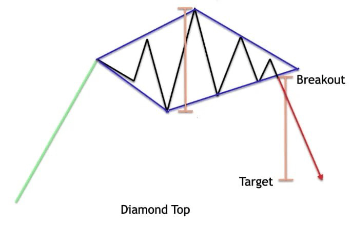 ▪️ Čtyři trendové čáry: kosočtverec se formuje čtyřmi trendovými čarami, které spojují po sobě jdoucí maxima a minima, vytvářející figuru, která vypadá jako diamant nebo kosočtverec.