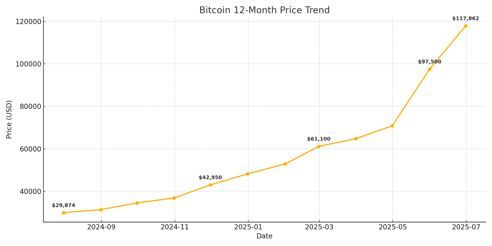 K datu 11. července 2025 se cena Bitcoinu pohybuje mezi $116,494.50 (CoinDesk) a $118,498.96 (CoinMarketCap), s nárůstem o 6.68% za posledních 24 hodin. Toto nové historické maximum, které překonává $112,000 dosažených v květnu, odráží býčí momentum řízené několika klíčovými faktory: