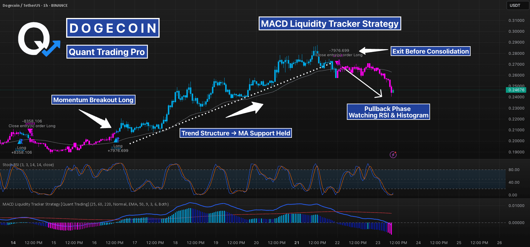Tento graf ukazuje, jak strategie sledování likvidity MACD [normální režim] fungovala na DOGE během posledních několika dní. Strategie vstoupila během jasného breakout momentum a čistě se držela nad svým MA filtrem téměř 48 hodin.