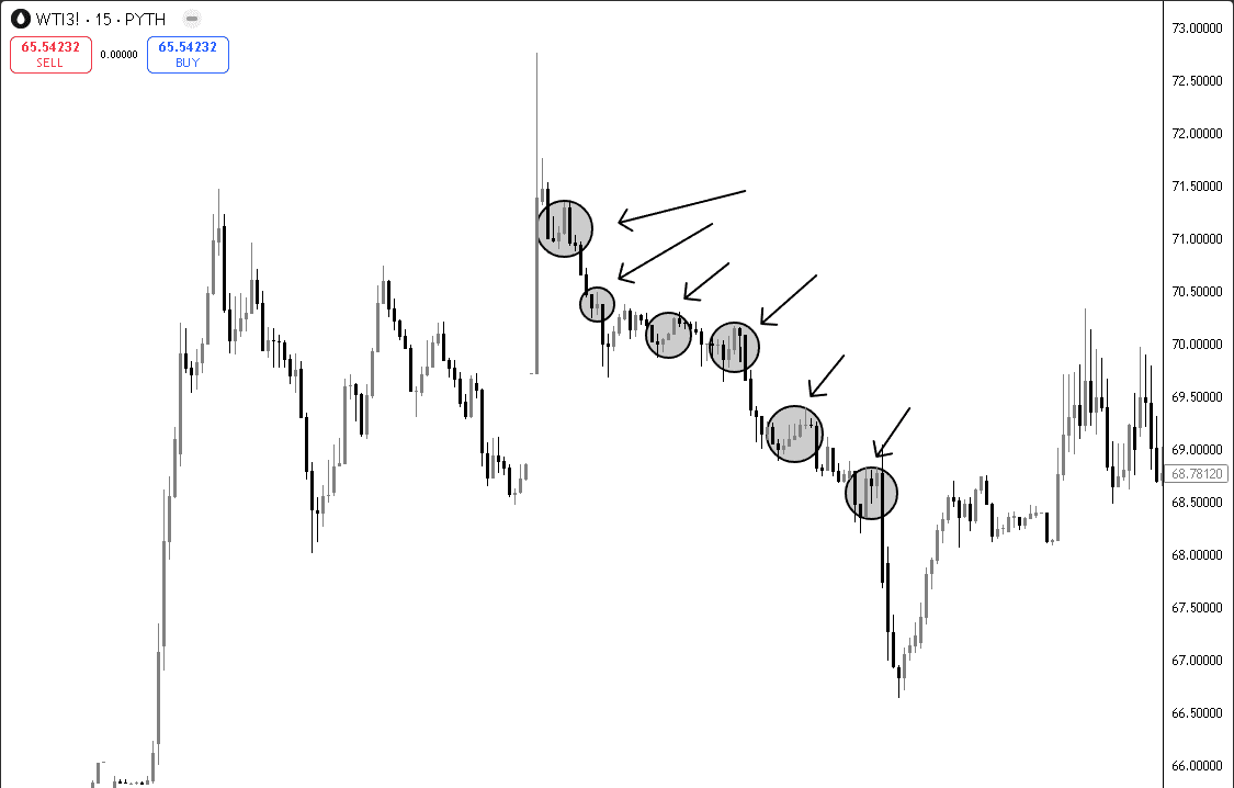 Nyní druhý příklad je ropa. V tomto okamžiku probíhal konflikt mezi Íránem a Izraelem, a kvůli situaci ceny ropy rychle rostly. Všichni byli připraveni otevřít nákupní pozice, když se trh v pondělí otevřel, ale místo toho začal trh velmi rychle klesat. V celém tomto poklesu maloobchodníci neustále otevírali nákupní pozice v naději, že cena již klesla příliš a okamžitě vzroste - ale všichni byli uvězněni.