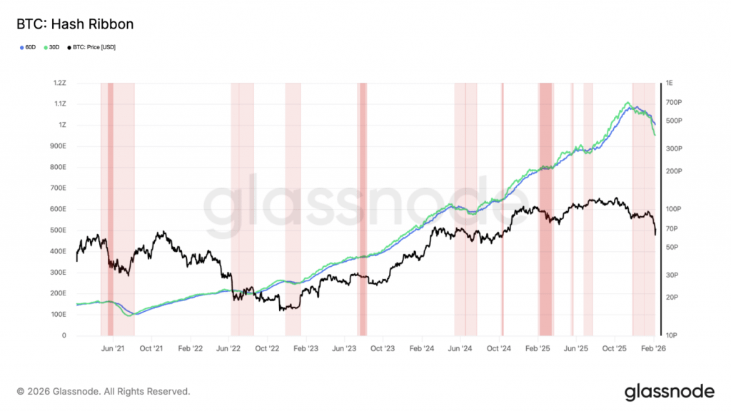 Indikátor Hash Ribbons také zaslal znepokojující signál: 30denní průměr hashrate klesl pod 60denní - negativní inverze, která historicky ukazuje na vážný stres v příjmech minerů a zvyšuje riziko kapitulace.