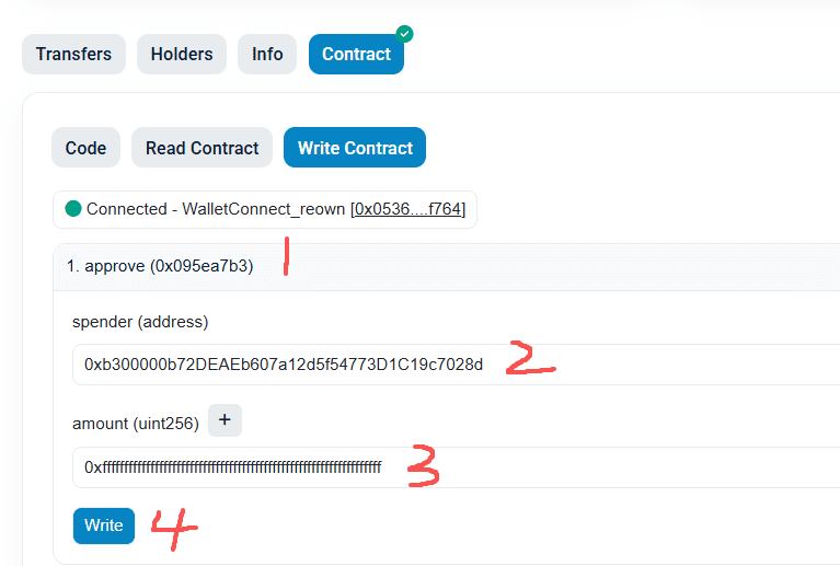4️⃣ Najděte funkci approve, vyplňte dva parametry: