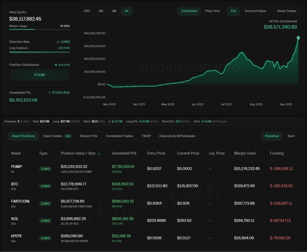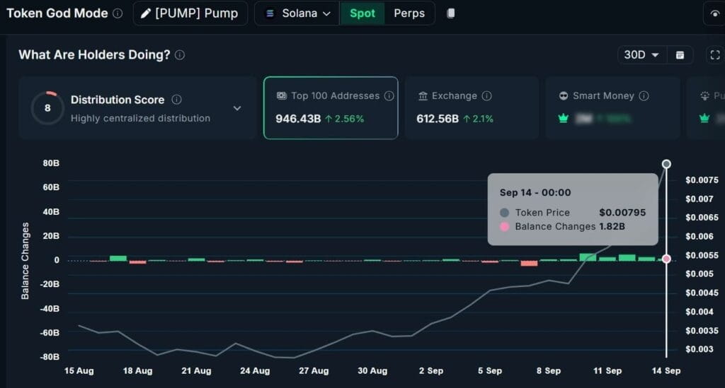 Účast velryb na trhu PUMP je také velmi pozoruhodná. Velrybí peněženky dominovaly v posledních 6 dnech, což naznačuje rostoucí poptávku po této kryptoměně. Dne 14. 9. velryba provedla nákup 3,24 miliardy tokenů, i když tato částka klesla z 6,25 miliardy tokenů den předtím. V době psaní článku, zůstatek velryby zaznamenal změnu 1,8 miliardy, mírně se snížil z 3,1 miliardy den předtím, ale stále ukazuje na silnou akumulaci ze strany velkých investorů.