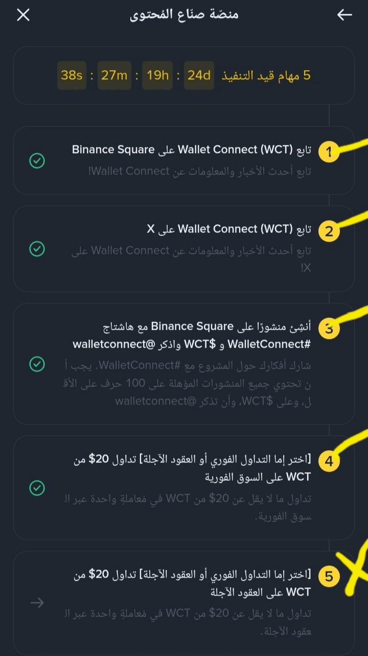 Za čtvrté👈když vstoupíte do jakékoli měny, která má akci, najdete řadu úkolů, které musíte splnit, abyste byli způsobilí k nárokování odměny, dokončete úkoly a všimněte si, že jsem označil úkol číslo pět křížkem, protože úkoly obchodování 4, 5 a 6 si můžete vybrat mezi okamžitým obchodováním nebo futures kontrakty nebo vzájemným stavem a z mého osobního názoru je okamžité obchodování pro vás bezpečný způsob a jakmile je dokončíte, nebudete muset dokončit ostatní obchodní úkoly.