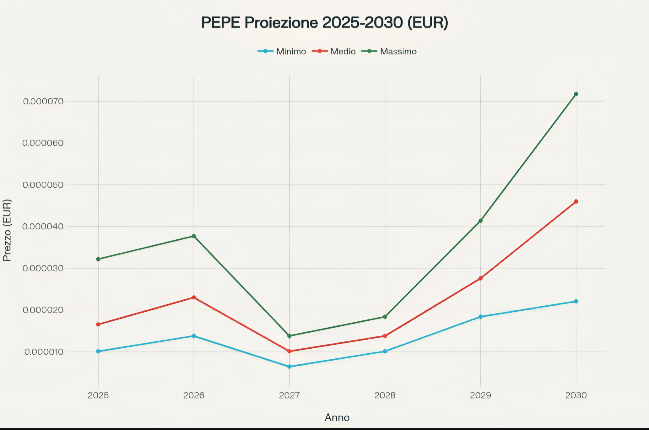 - 2029-2030: Nová fáze růstu 2029: Rozmezí €0.000018 - €0.000041 (průměrná cena €0.000028) 2030: Rozmezí €0.000022 - €0.000072 (průměrná cena €0.000046). Pro období 2029-2030 analytici předpovídají novou fázi růstu, s možnými vrcholy až do $0.000078. Tento scénář předpokládá širší přijetí meme coin v mainstreamu a integraci nových užitečných prvků do projektu.