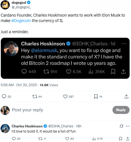 Svět kryptoměn znovu šumí. Charles Hoskinson, zakladatel Cardano (ADA), znovu otevřel svou nabídku Elonu Muskovi — tentokrát s odvážnou misí: proměnit Dogecoin v oficiální měnu platformy X.