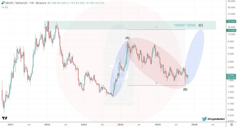 Týdenní graf NEAR/USDT naznačuje větší strukturu vln A-B-C, což naznačuje, že token by mohl být blízko konce své korekční fáze. Podle vzoru současná cena kolem $2.32 označuje bod (B)—potenciální zónu obratu, odkud by mohla začít nová vzestupná vlna. Očekávaná cílová zóna (C) leží mezi $14 a $20, což naznačuje možný 6x až 8x nárůst od současných úrovní, pokud se býčí struktura rozvine. To odpovídá dlouhodobému obnovovacímu nastavení spíše než krátkodobému oživení, což činí NEAR jedním z nejvíce slibných středněkapitálových tokenů, které je třeba sledovat v nadcházejících měsících.